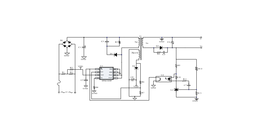 SP6616HF是一顆電流模式PWM控制芯片,內置650V高壓功率MOSFET,應用于功率在12W以內的方案。SP6616HF在PWM模式下工作于固定開關頻率,這個頻率是由內部精確設定。在空載或者輕載時,工作頻率由IC內部調整。芯片可以工作在綠色模式,以此來減小輕載時的損耗,提高整機的工作效率。SP6616HF在啟動和工作時只需要很小的電流,可以在啟動電路中使用一個很大的電阻,以此來進一步減小待機時的功耗。芯片內置有斜坡補償電路,當電路工作于大占空比時,避免次諧波振蕩的發生,改善系統的穩定性。內置有前沿消隱時(Leading-edge blanking time),消除緩沖網絡中的二極管反向恢復電流對電路的影響。SP6616HF采用了抖頻技術,能夠有效改善系統的EMI性能。系統的跳頻頻率設置在音頻(20KHz)以上,在工作時可以避免系統產生噪音。SP6616HF內置多種保護,包括輸出過壓保護(VOUT OVP),逐周期限流保護(OCP),過載保護(OLP),過壓保護(VDD OVP),VDD過壓箝位,欠壓保護(UVLO),過溫保護(OTP)等,通過內部的圖騰柱驅動結構可以更好的改善系統的EMI特性和開關的軟啟動控制