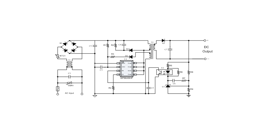 SP6648HF是一顆電流模式PWM控制芯片,內(nèi)置650V高壓功率MOSFET,應(yīng)用于功率在18W以內(nèi)的方案。SP6648HF在PWM模式下工作于固定開關(guān)頻率,這個(gè)頻率是由內(nèi)部精確設(shè)定。在空載或者輕載時(shí),工作頻率由IC內(nèi)部調(diào)整。芯片可以工作在綠色模式,以此來減小輕載時(shí)的損耗,提高整機(jī)的工作效率。SP6648HF在啟動(dòng)和工作時(shí)只需要很小的電流,可以在啟動(dòng)電路中使用一個(gè)很大的電阻,以此來進(jìn)一步減小待機(jī)時(shí)的功耗。芯片內(nèi)置有斜坡補(bǔ)償電路,當(dāng)電路工作于大占空比時(shí),避免次諧波振蕩的發(fā)生,改善系統(tǒng)的穩(wěn)定性。內(nèi)置有前沿消隱時(shí)(Leading-edge blanking time),消除緩沖網(wǎng)絡(luò)中的二極管反向恢復(fù)電流對(duì)電路的影響。SP6648HF采用了抖頻技術(shù),能夠有效改善系統(tǒng)的EMI性能。系統(tǒng)的跳頻頻率設(shè)置在音頻(22KHz)以上,在工作時(shí)可以避免系統(tǒng)產(chǎn)生噪音。SP6648HF內(nèi)置多種保護(hù),包括逐周期限流保護(hù)(OCP),過載保護(hù)(OLP),過壓保護(hù)(VDD OVP),VDD過壓箝位,欠壓保護(hù)(UVLO),過溫保護(hù)(OTP)等,通過內(nèi)部的圖騰柱驅(qū)動(dòng)結(jié)構(gòu)可以更好的改善系統(tǒng)的EMI特性和開關(guān)的軟啟動(dòng)控制。