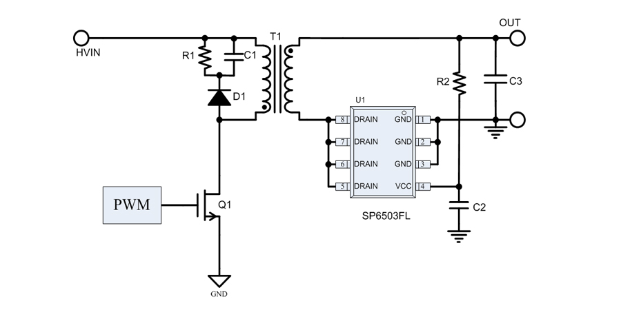 SP6503FL是一顆應用于隔離反激電源系統的次級同步整流芯片。通過模擬次級肖特基整流二極管的工作并以極低的導通電阻來減小損耗。SP6503FL可以工作在斷續模式(DCM)和準諧振模式(QR)。使用先進的消隱技術使得芯片在各種工作模式下可以穩定可靠地工作。