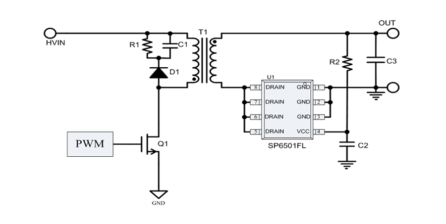 SP6501FL檢測(cè)內(nèi)置MOSFET的導(dǎo)通電阻(Rds-on)上的壓降,來(lái)控制MOSFET的開(kāi)關(guān)。應(yīng)用外圍簡(jiǎn)單。適用于5V輸出的應(yīng)用方案。