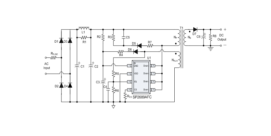 SP2689AFC is a high performance offline PSR power switch for low power AC/DC charger and adapter applications. Using 3D packaging technology, integrated 7A/650V MOSFET in the SOP8 package.It operates in primary-side sensing and regulation. Thus, opto-coupler and TL431 are not required. In CC control, the output current and power setting can be adjusted externally by the sense resistor RCS at CS PIN. In CV control, multi-mode operations are utilized to achieve high performance and high efficiency. In addition, good load regulation is achieved by the built-in cable drop compensation. SP2689AFC operates in PFM in CC mode, and it operates in PWM+PFM in CV mode with frequency reduction at light/medium load. The chip consumes very low operation current. It achieves less than 75mW standby power to meet all global energy efficiency regulations.